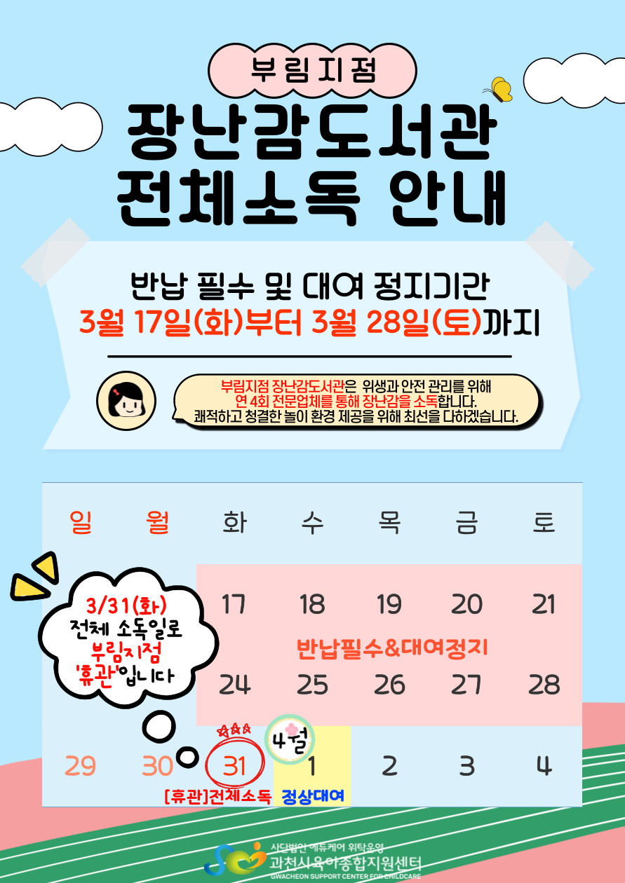 ★ 소독일: 3월31일(화) 전체 소독일로 장난감도서관, 시간제보육, 놀이실 휴관입니다.