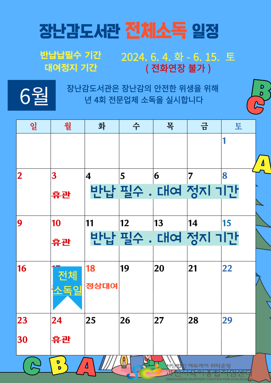 장난감도서관 2분기 소독예정(대여정지, 반납필수(반납만가능), 전화연장 불가)