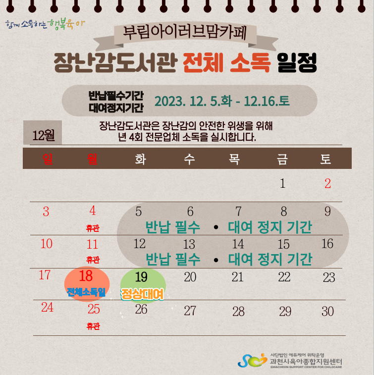 장난감도서관 4분기 소독예정(대여정지, 반납필수, 전화연장 불가)