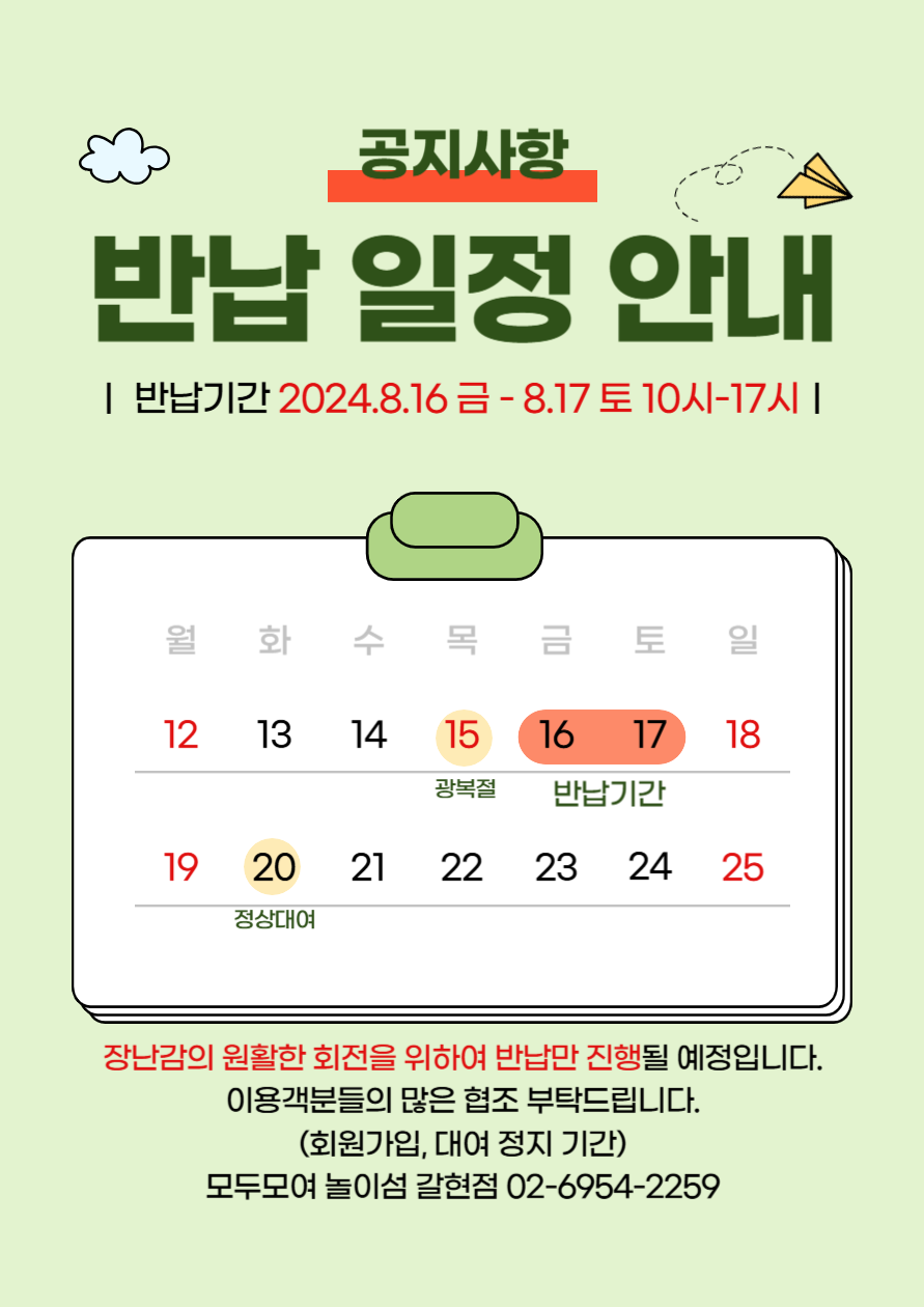 ▶ 일시 : 8월 16일(금), 17일(토) / 장난감 반납 업무만 진행(대여 및 회원가입 정지)